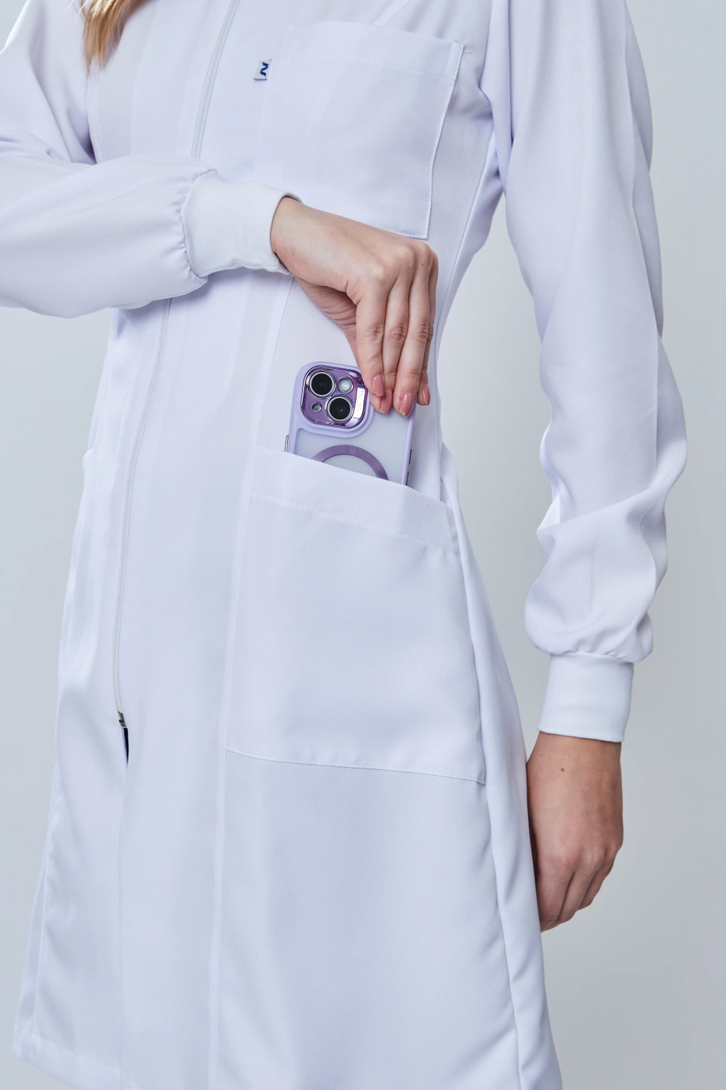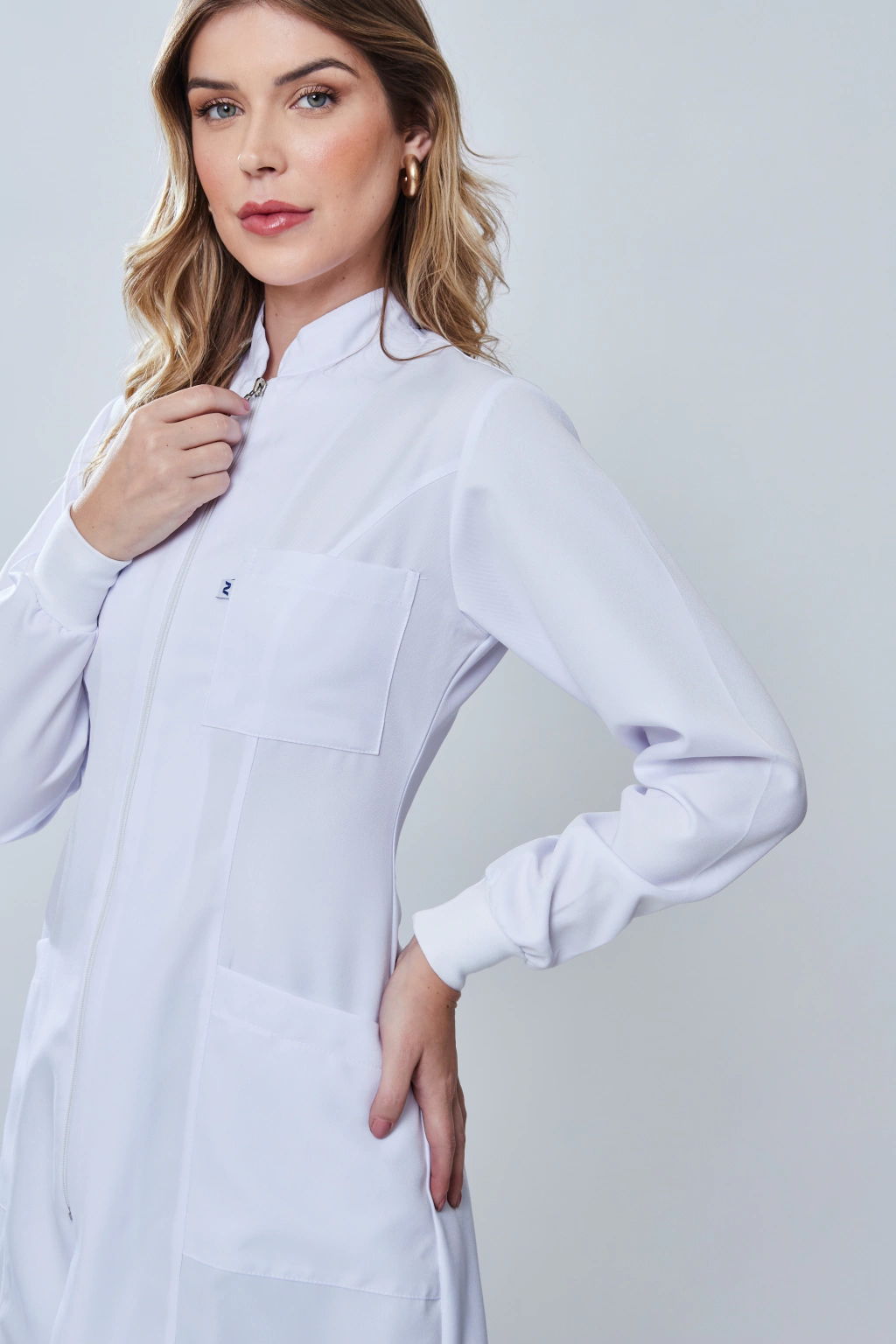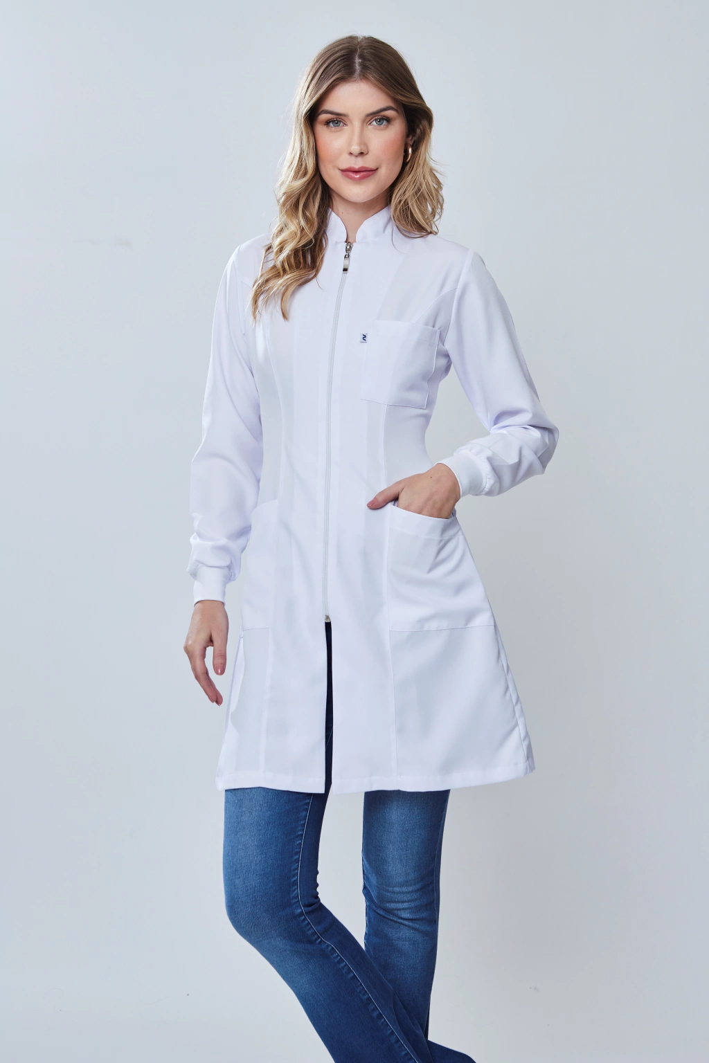 Fabricado em gabardine premium com composição 100% poliéster e strech mecânico, este jaleco combina sofisticação e funcionalidade sem igual. Seus detalhes incluem gola padre, punhos de ribana e fechamento com zíper de nylon, garantindo um produto de alta qualidade e durabilidade.