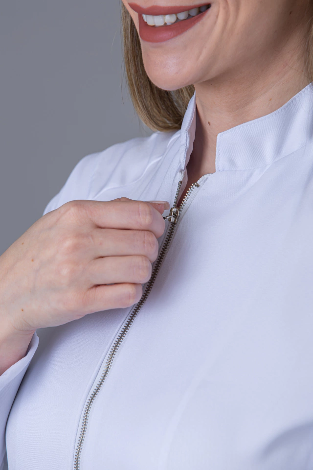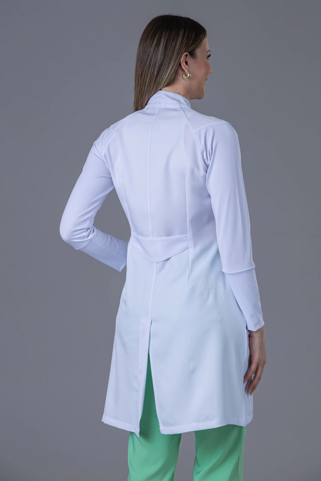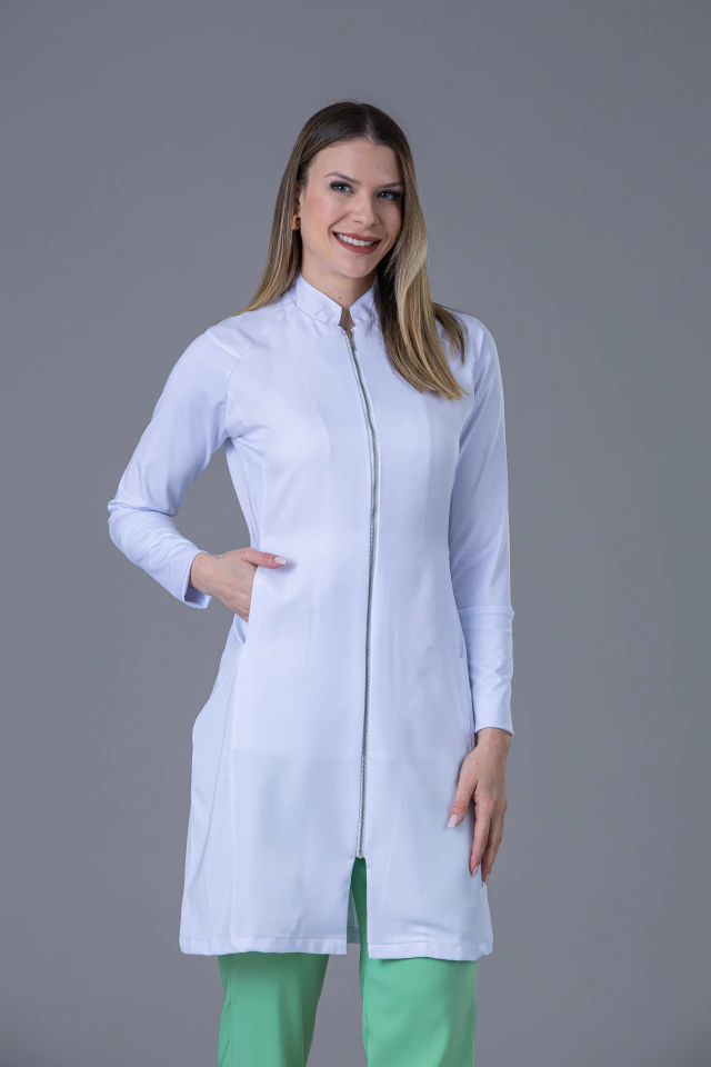 Jaleco branco Manga Longa em poliéster 100%, resistente e de fácil manutenção.